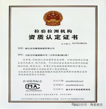 由协会共同参与组建的第三方陶瓷检测机构(湖北宜信陶瓷检测有限公司)已获得湖北省市场监管部门的批准,是目前全省唯一一家从事陶瓷、玻璃制品、日用卫生陶瓷及相关配件产品质量检验检测、原材料分析、产品质量认证等的专业第三方检验检测机构。2024年,湖北省市场监督管理局批准在公司建立宜昌质量基础设施一站式服务--湖北当阳建筑陶瓷工业园服务站;2025年1月,公司又被湖北省市场监督管理局授权对全省陶瓷生产、销售企业进行陶瓷砖等产品进行质量监督应急监督抽样抽查检验检测工作。