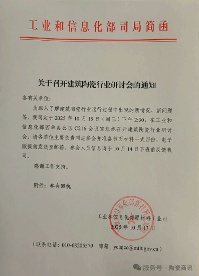 为深入了解建筑陶瓷行业运行过程中出现的新情况、新问题,工业和信息化部原材料工业司于2025年10月15日下午2:30在北京组织部分省份陶瓷工业协会负责人和部分陶瓷企业负责人在北京召开建筑陶瓷行业研讨会。