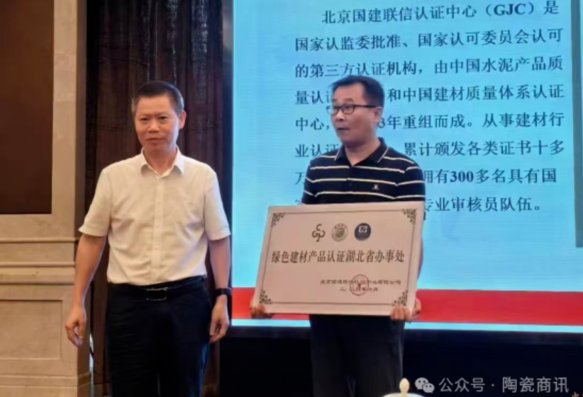 7月29日,北京国建联信认证中心有限公司张武主任正式授予湖北陶瓷工业协会《绿色建材产品认证湖北省办事处》的牌子,当湖北陶协和湖北宜信陶瓷检测有限公司联手接过这个牌子时,作为具有CMA资质的第三方专业检测机构,再次向行业承诺。